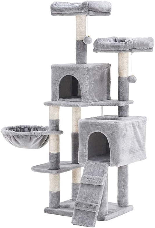 58'' Multi-Level Cat Tree Condo Furniture with Sisal-Covered Scratching Posts, 2 Plush Condos, Hammock for Kittens, Cats and Pets Light Gray MPJ013W